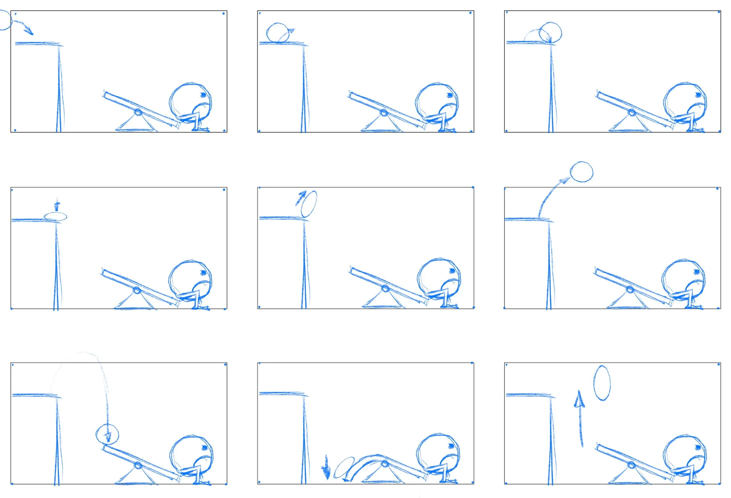 Armed with a clear description I created a quick storyboard in Procreate on my iPad. The original idea was to have just a heavy “cartoon weight” or anvil on the teeter totter, but then I decided to add a second character that would just be sitting there oblivious to the action going on behind it. The “Monster Ball” character was perfect for that because he looks heavy and is also a simple rig with minimal controls.