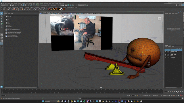 Then I made a decision to try and have the Monster open his mouth and stick out it’s tongue in response to Tailer saying “are you ready?” This led me to YouTube and looking at slow motion video of dogs panting. LOL you can find anything there!! I also wasn’t quite sure how to move him in his little excited hop, so I shot some reference footage of myself and timed it up with the dog panting to put into Maya as a reference plane…