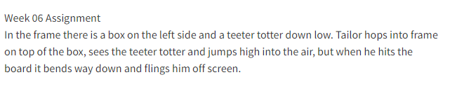 Week 6 of Animation basics is the beginning of a 2 week project on the concepts of overlapping action and squash and stretch. The goal is to create a short animation using the “Tailor” rig. The first week of the project is just getting the body to feel “bouncy” and then the second week will be adding in the tail.